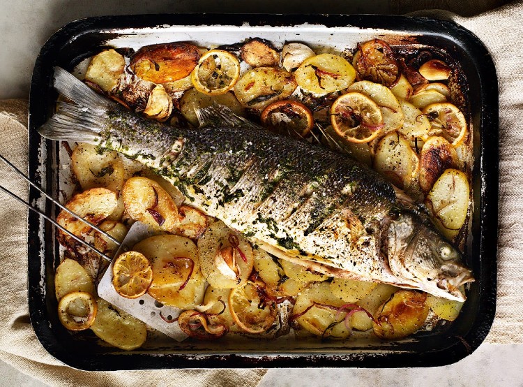 Τοποθετούμε το ψάρι πάνω απ’ τα υλικά μας, αλατοπιπερώνουμε, ρίχνουμε ρίγανη και περιχύνουμε με τον χυμό λεμονιού και λίγο ελαιόλαδο. Βάζουμε τα ντοματάκια επάνω στο ψάρι.