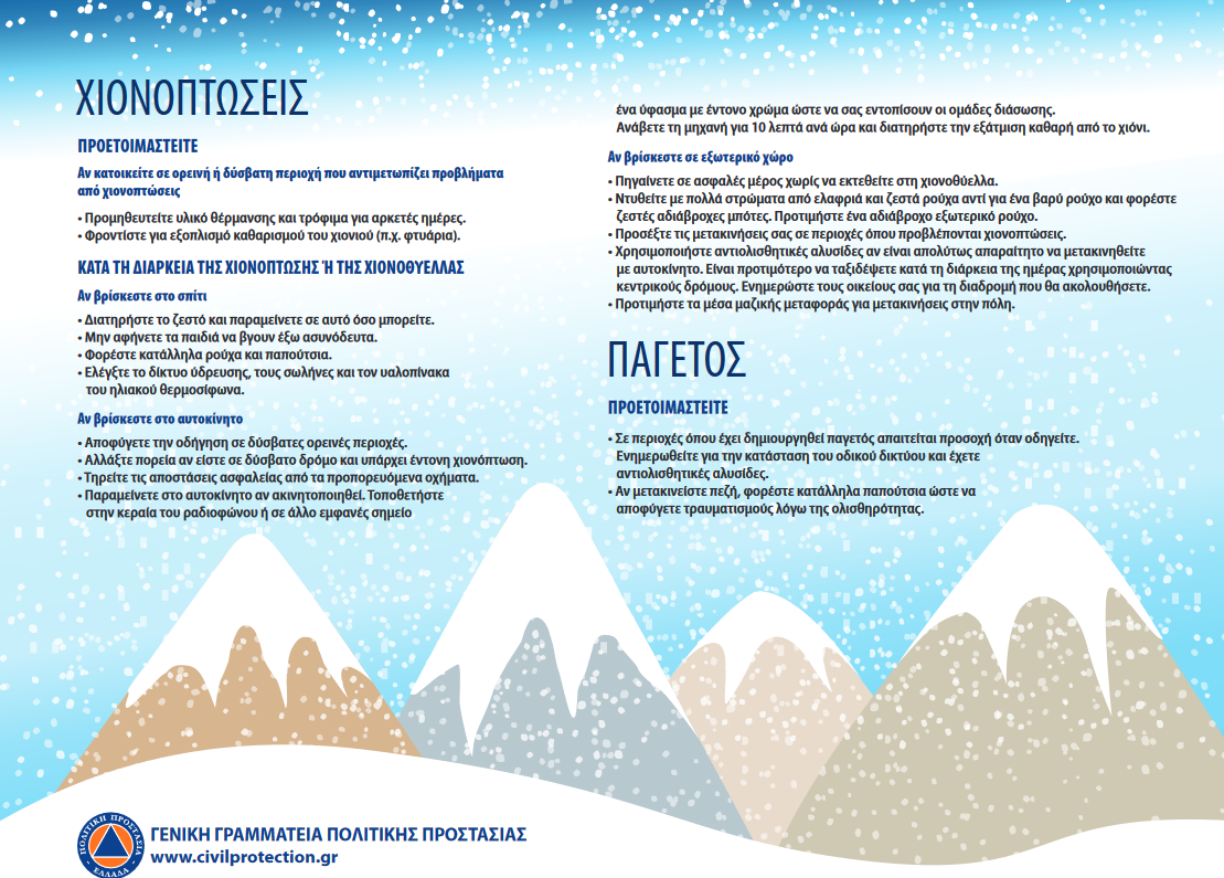 - Φροντίστε να ενημερώνεστε διαρκώς από το ραδιόφωνο και την τηλεόραση για την εξέλιξη των καιρικών φαινομένων. Οι επίσημες πηγές ενημέρωσης είναι η Εθνική Μετεωρολογική Υπηρεσία (Ε.Μ.Υ.) και η Γενική Γραμματεία Πολιτικής Προστασίας.