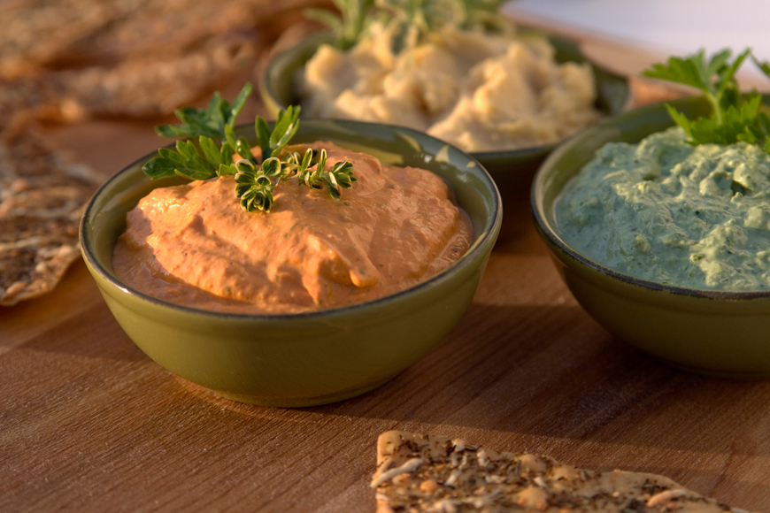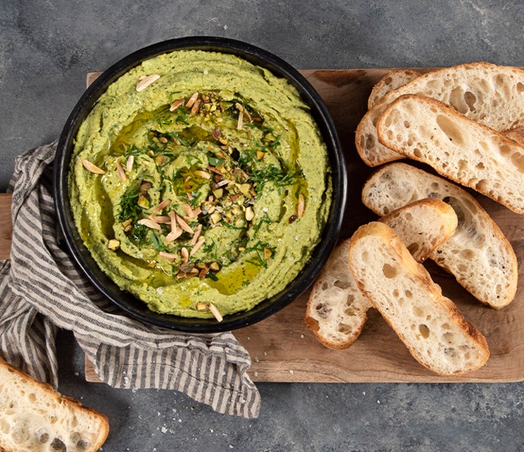 Ρίχνουμε τα μισά ρεβύθια, χτυπάμε καλά και μετά προσθέτουμε τα υπόλοιπα. Ξαναχτυπάμε, ώσπου να έχουμε την επιθυμητή σύσταση και το «πράσινο» χούμους μας είναι έτοιμο!