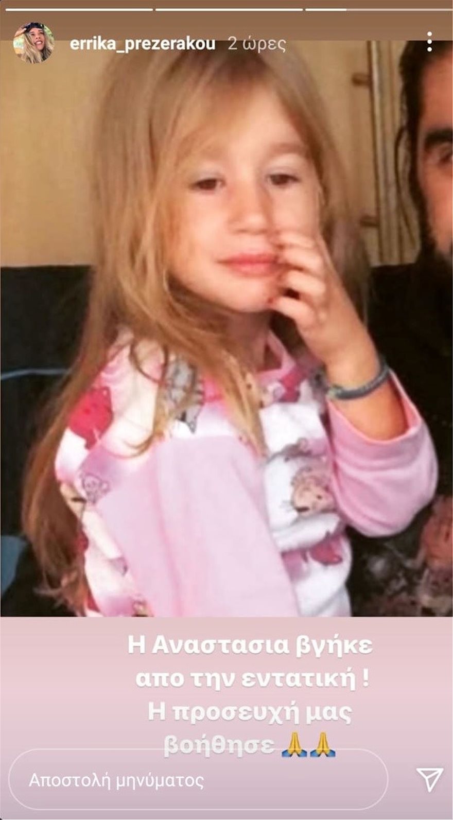H Έρρικα Πρεζεράκου αποκάλυψε μέσω μιας φωτογραφίας που ανέβασε σαν story στο instagram ότι οι προσευχές όλων βοήθησαν το μικρό κοριτσάκι στην υγεία του, καθώς βγήκε από την εντατική. Παρόλο που δεν υπάρχουν περισσότερες πληροφορίες, το μήνυμα ήταν αρκετά αισιόδοξο και μας γέμισε χαρά και ελπίδα.