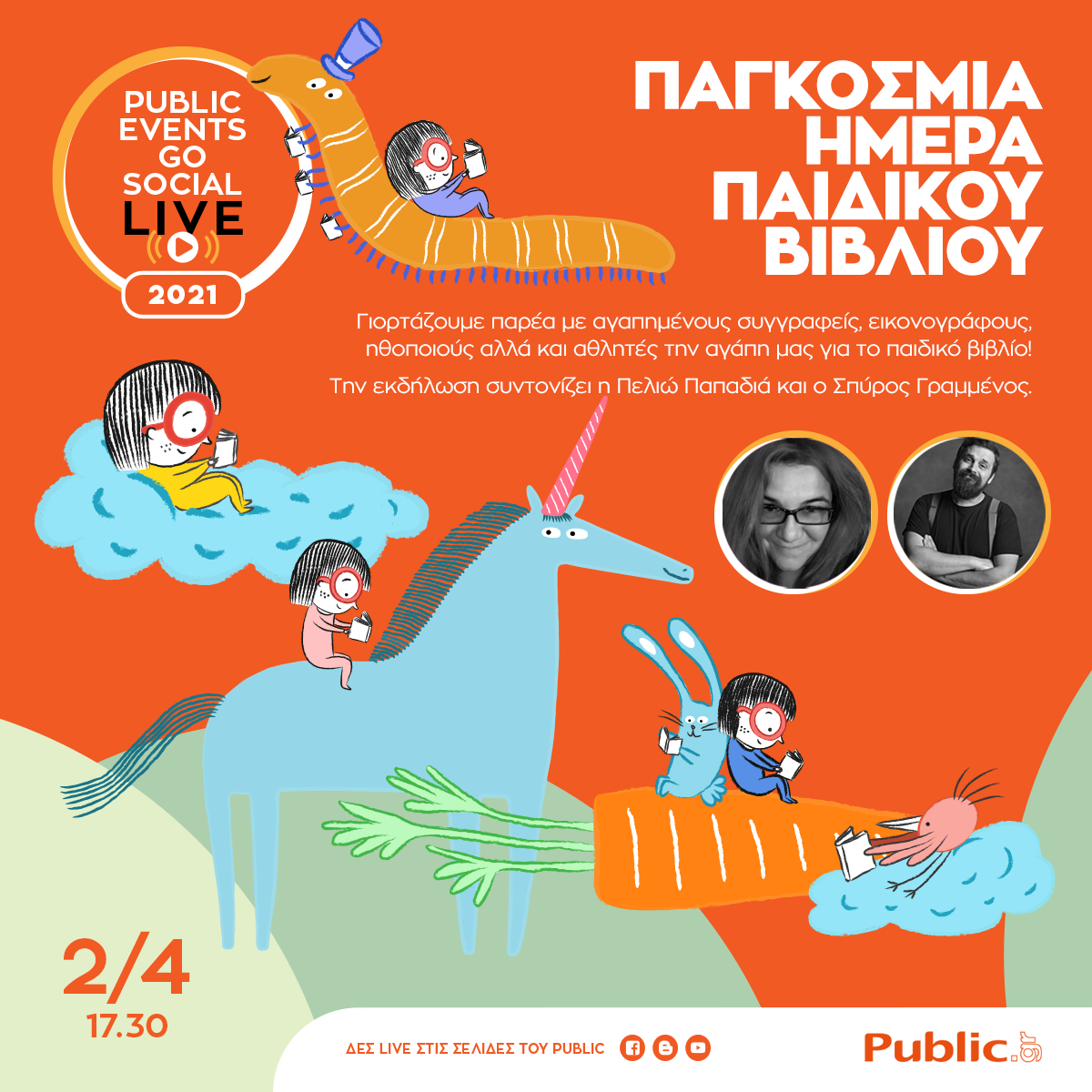 Φέτος τον Απρίλιο, το παιδικό βιβλίο έχει την τιμητική του στο Public. Με αφορμή την Παγκόσμια Ημέρα Παιδικού Βιβλίου το #1 βιβλιοπωλείο προσκαλεί το κοινό την Παρασκευή 2 Απριλίου στις 17:30 σε μια σπάνια διαδικτυακή συνάντηση με κορυφαίους συγγραφείς και σκιτσογράφους, που θα μιλήσουν με διαδραστικό τρόπο για τους χαρακτήρες που δημιούργησαν και τις περιπέτειές τους! Όλα αυτά, σε ζωντανή μετάδοση, μέσα από τη σελίδα του Public στο Facebook και το κανάλι του Public στο YouTube.