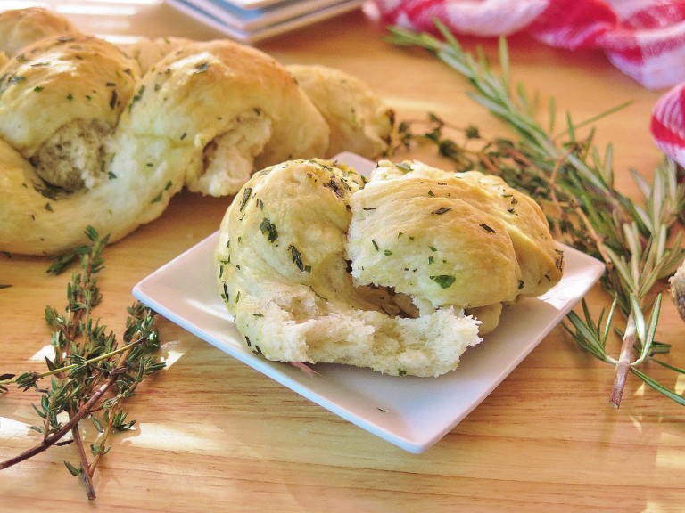 Χωρίζουμε τη ζύμη σε 3 ή 4 ίσα κομμάτια και τα αλείφουμε με μείγμα από τα βότανα. Φτιάχνουμε την πλεξούδα και ψήνουμε σε προθερμασμένο φούρνο στους 180 βαθμούς μέχρι να ροδίσει.