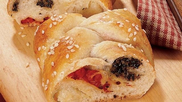 Με τα χέρια μας αρχίζουμε και στρίβουμε τα ενωμένα φύλλα και δημιουργούμε ένα στριφτό καρβέλι σαν κοτσίδα ώσπου να φαίνεται η γέμιση ανάμεσα στις στρώσεις. Μεταφέρουμε σε ένα ταψί, στρώνουμε μία λαδόκολλα και ψήνουμε σε προθερμασμένο φούρνο στους 180 βαθμούς μέχρι να ροδίσει.