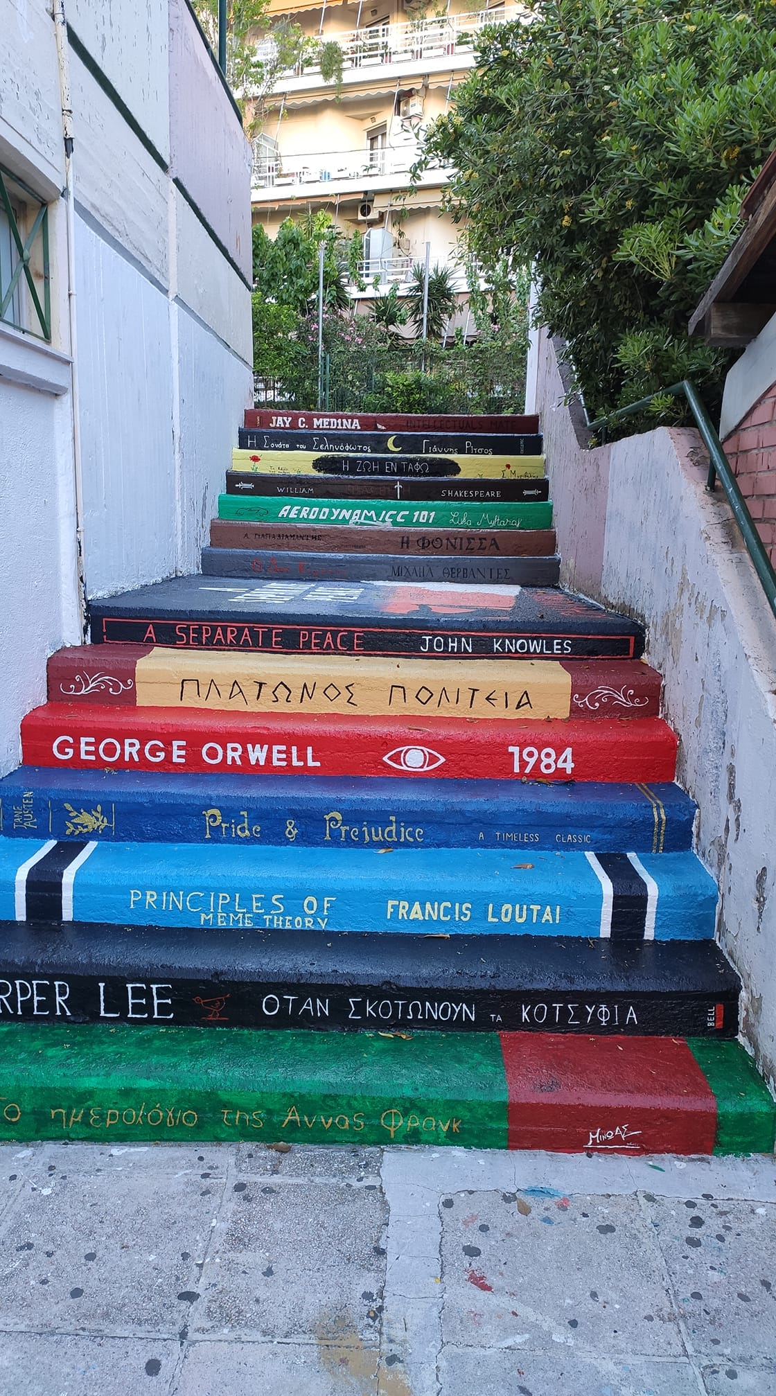 «Το ημερολόγιο της Άννας Φρανκ», «Όταν σκοτώνουν τα κοτσύφια» της Χάρπερ Λι, «Περηφάνια και Προκατάληψη» της Τζέιν Όστεν, «1984» του Όρσον Γουέλς, «Πλάτωνος Πολιτεία», «Η φόνισσα» του Παπαδιαμάντη, «Ο Δον Κιχώτης» του Θερβάντες, «Η ζωή εν τάφω» του Στράτη Μυριβήλη, «Μάκβεθ» του Σέξπιρ, «Η Σονάτα του Σεληνόφωτος» του Γιάννη Ρίτσου είναι μερικά από τα εμβληματικά βιβλία που κοσμούν πλέον τις σκάλες του σχολείου.
