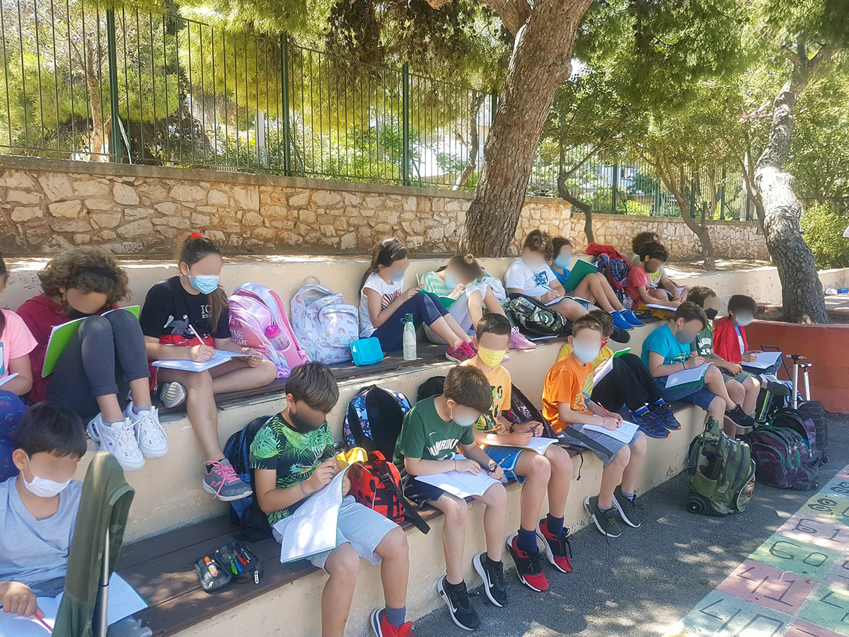 Το μόνο που χρειάστηκε να κάνουν μαθητές και εκπαιδευτικός, ήταν να κουβαλήσουν στο προαύλιο τα βιβλία και τα τετράδιά τους, έναν φορητό ασπροπίνακα και φυσικά τις μάσκες τους. Η πρωτοβουλία της εκπαιδευτικού της Δ’ τάξης του Δημοτικού της Βουλιαγμένης Σοφία Κακάτση ήταν μια ευχάριστη έκπληξη για τα παιδιά αφού άλλαξαν παραστάσεις ενώ το μάθημα παραδόθηκε με μεγαλύτερη ασφάλεια.