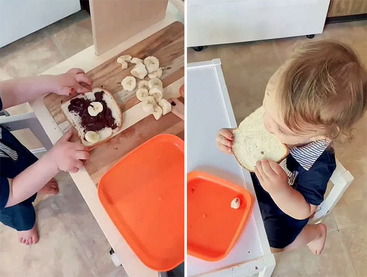 Σε πρόσφατο βιντεάκι της έδειξε τον 17 μηνών γιο της να φτιάχνει χούμους, να αλείφει νουτέλα στο ψωμί του ή να κόβει τις μπανάνες του στην μικρή του κουζινούλα.