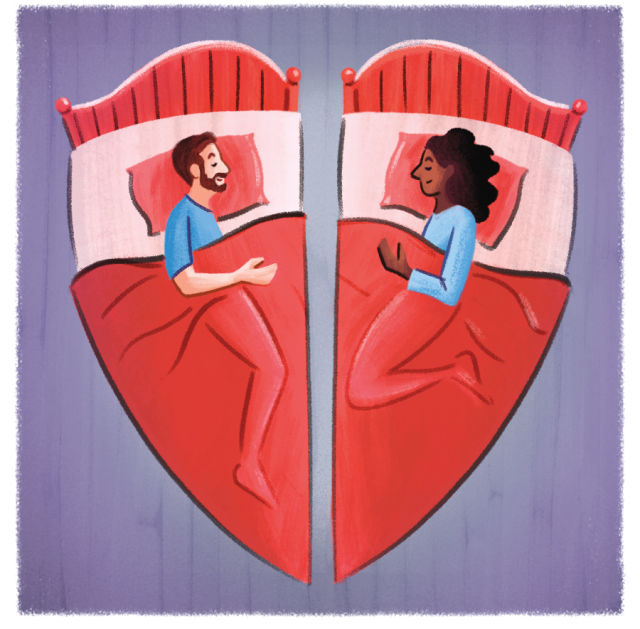 Καταπιεστήκαμε και οι δυο για αρκετά χρόνια προσπαθώντας να συμβιβαστούμε μέχρι που ένα βράδυ πήραμε την απόφαση να κοιμόμαστε χώρια. Αγοράσαμε δυο κρεβάτια και τοποθετήσαμε στη μέση ένα παραβάν. Στη μεριά μου προφανώς η τηλεόραση παίζει ακόμα τα βράδια! Αν ξέραμε πόσο καλό θα έκανε στη σχέση μας, θα το είχαμε εφαρμόσει νωρίτερα. Μεταξύ μας δεν έχει αλλάξει τίποτα, εκτός το ότι κοιμόμαστε και οι δυο καλά και δεν έχουμε νεύρα το πρωί».