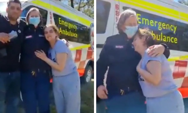 Η μαμά του αγοριού, η κυρία Ελφαλάκ αγκαλιάζει τους αστυνομικούς ανακουφισμένη, καθώς φωνάζει τον άντρα της να δει τον γιο τους που είναι σώος και αβλαβής.