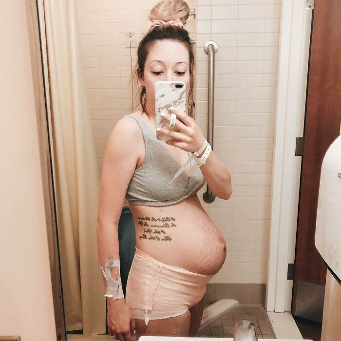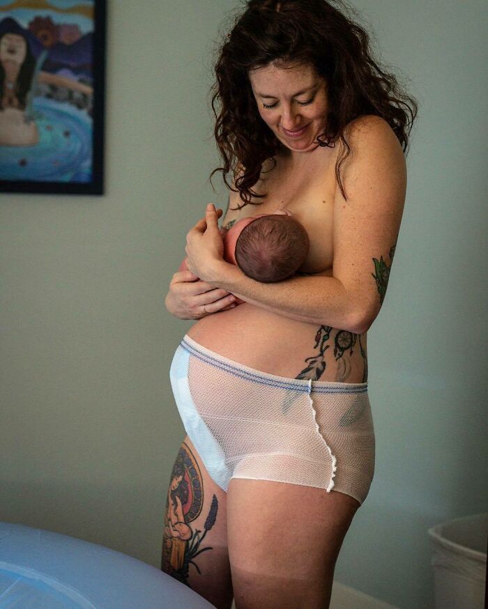 «Αυτό είναι το σώμα μου μετά τον τοκετό. Πρησμένο στήθος, πρησμένο (και άδειο!) στομάχι, ματωμένα εσώρουχα και μαξιλάρια. Είμαι κουρασμένη και πονάω. Αλλά η καρδιά μου είναι τόσο γεμάτη αγάπη, εκτίμηση και δέος.»