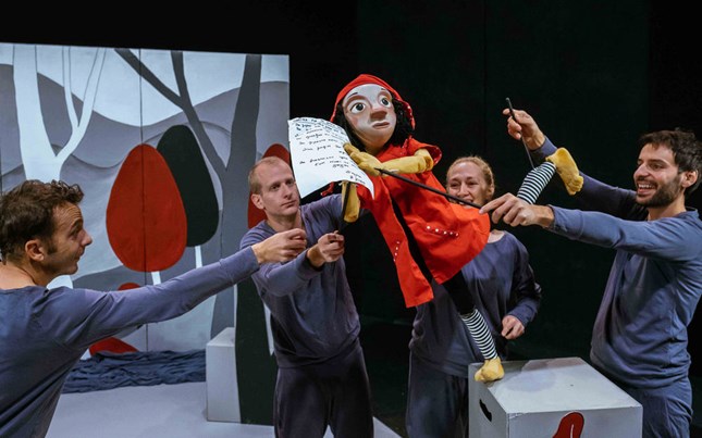 Συνοδοιπόροι σε αυτό της το ταξίδι οι μικροί θεατές, που συμμετέχουν ενεργά σε όλη τη διάρκεια της παράστασης. Είναι μια παράσταση με πρωταγωνιστές τις θεατρικές μάσκες και τις μαριονέτες. Τέσσερις ηθοποιοί επί σκηνής ενσαρκώνουν όλους τους ήρωες του παραμυθιού, ενώ όλοι μαζί σαν κουκλοπαίχτες ερμηνεύουν την Κοκκινοσκουφίτσα, καθώς χειρίζονται μια μεγάλη κούκλα τύπου Bunraku.