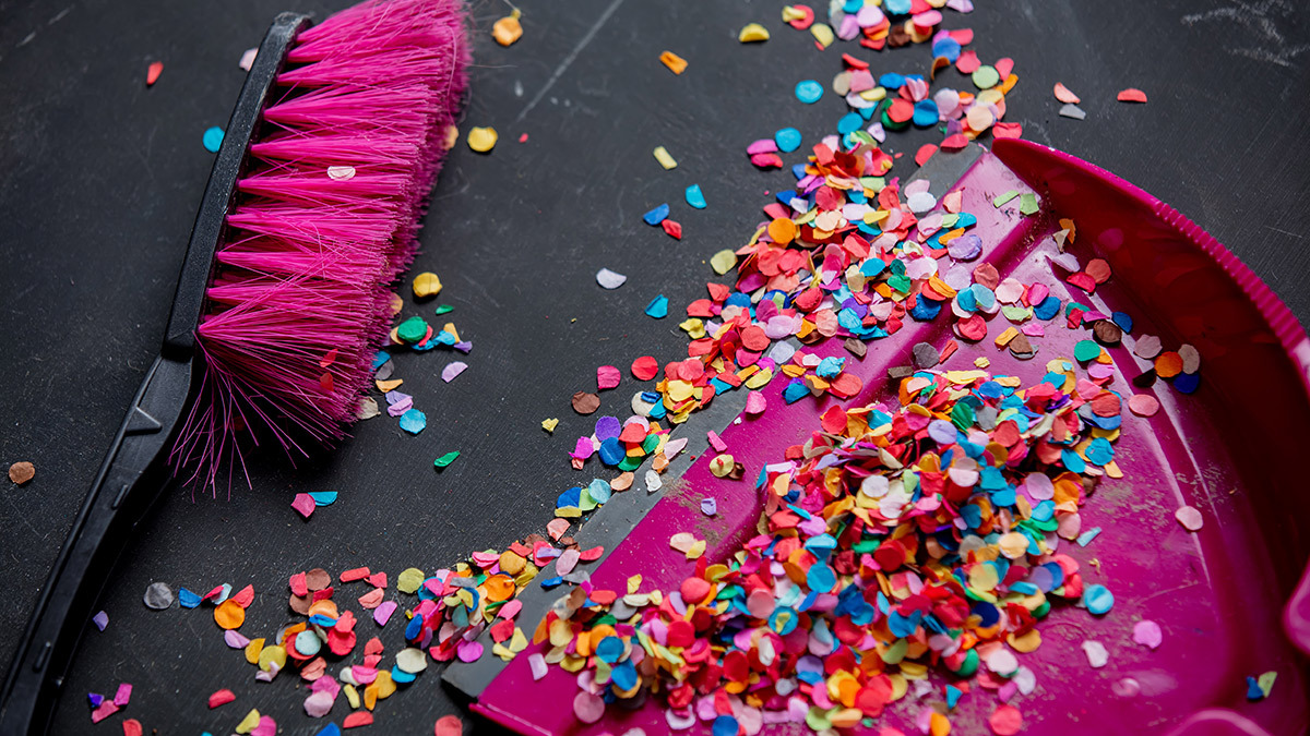 Αρχικά, σκουπίστε τυχόν κομφετί από την κορυφή επίπλων, φωτιστικών, ραφιών, τραπεζιών κ.λπ. Με ένα ξεσκονόπανο καθαρίστε τα και ρίξτε τα όλα στα πάτωμα. Για τις υφασμάτινες επιφάνειες, χρησιμοποιήστε ηλεκτρικό σκουπάκι.
