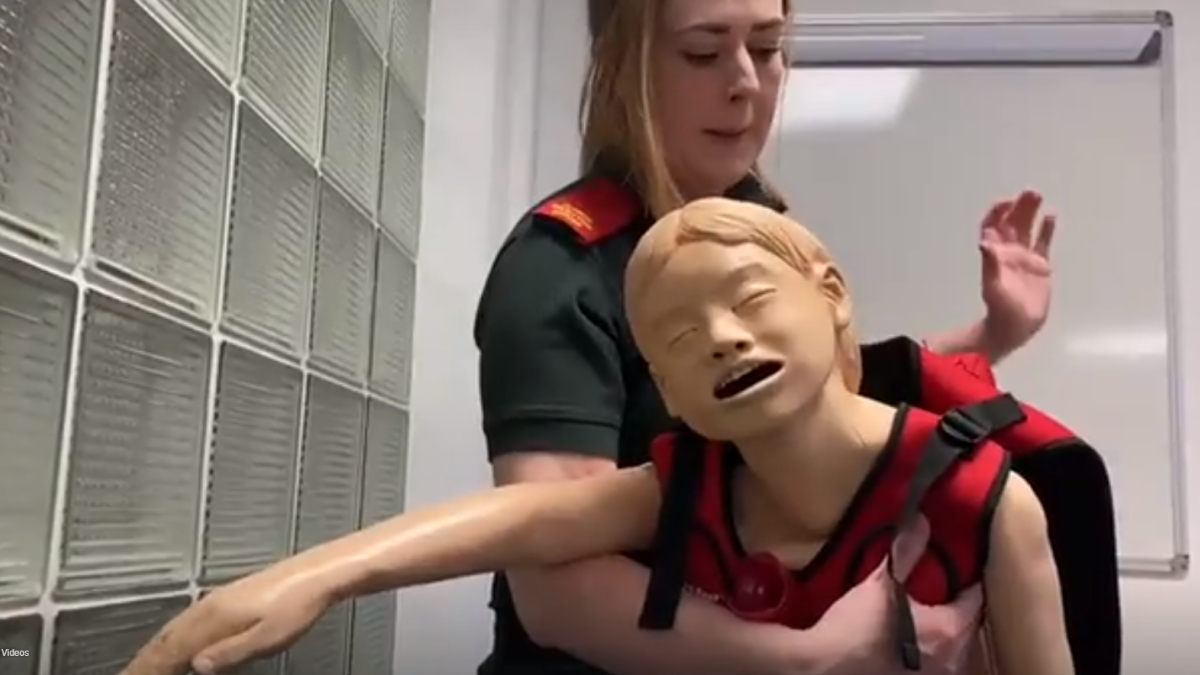 - Χρησιμοποιήστε το χέρι σας ως υποστήριξη, έτσι ώστε το παιδί να σκύβει μπροστά και χτυπήστε με 5 κοφτές κινήσεις ανάμεσα στις ωμοπλάτες.