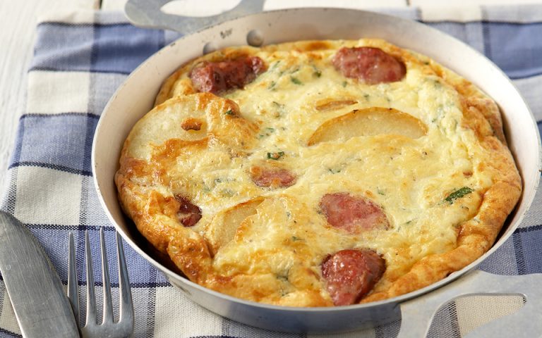 - Καθαρίζουμε και κόβουμε τις πατάτες σε ροδέλες και τις τηγανίζουμε στο ελαιόλαδο. Μόλις ροδίσουν και από τις δύο πλευρές, απλώνουμε στο τηγάνι τις φέτες της γραβιέρας, προσθέτουμε τα λουκάνικα, το μπέικον, το δυόσμο και το πιπέρι.