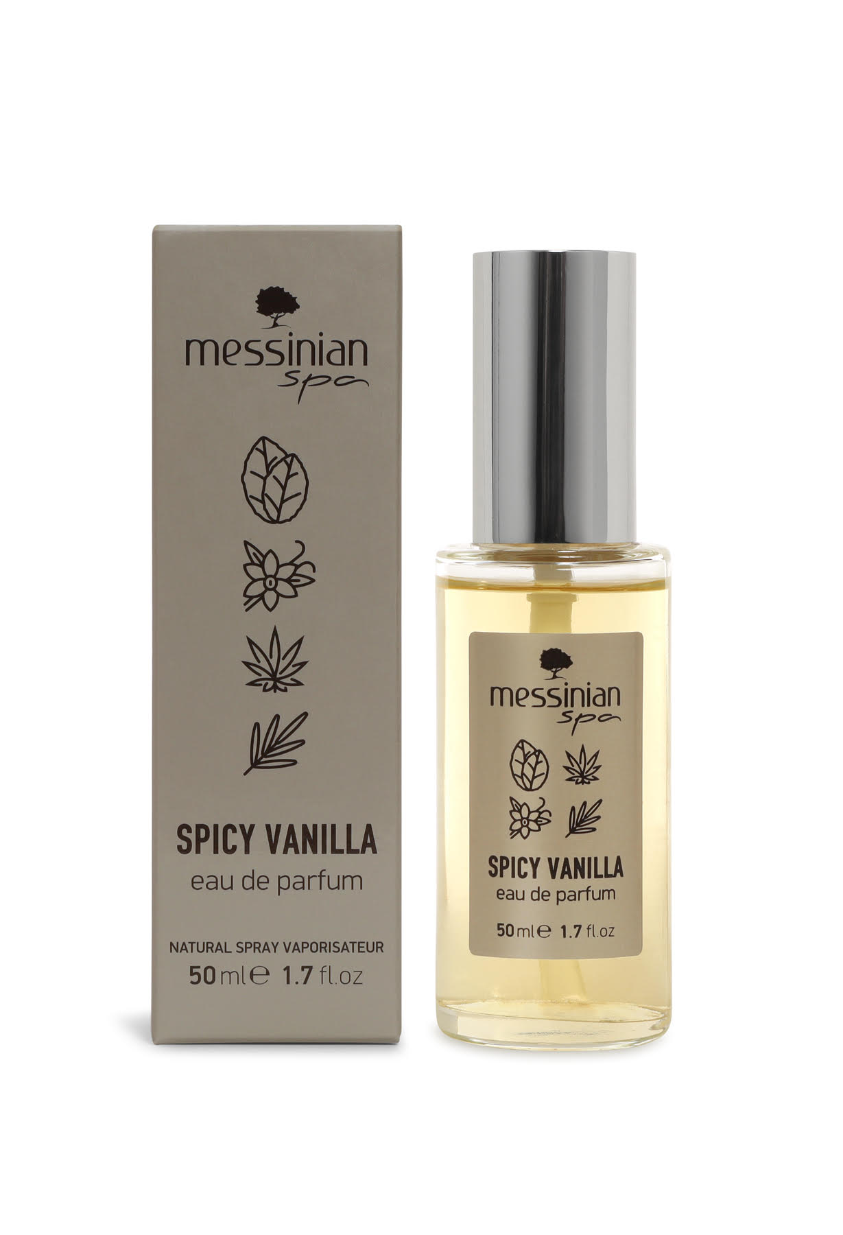 Το Messinian Spa Spicy Vanilla eau de parfum έχει ένα ζεστό, πικάντικο και unisex άρωμα με βανίλια, πλούσιες νότες μπαχαρικών, σπόρο tonka, άνθος καπνού, σε συνδυασμό με μία απαλή νότα ξύλου, κακάου και αποξηραμένων φρούτων.
