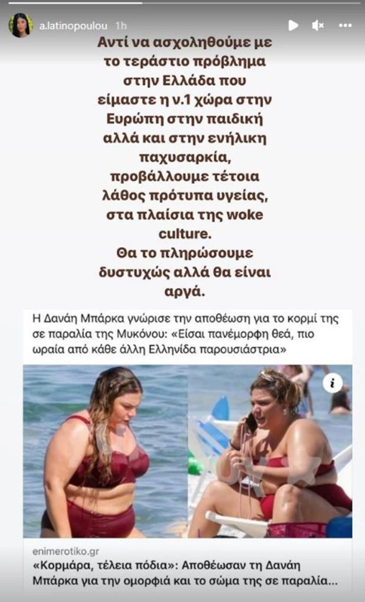 Η Αφροδίτη Λατινοπούλου αφού πρώτα αναδημοσίευσε άρθρο που αναφερόταν στην εμφάνιση της Δανάης Μπάρκα στην παραλία, την αποκάλεσε «λάθος πρότυπο» και σχολίασε ότι δεν θα έπρεπε να προβάλλονται άτομα με παχυσαρκία.