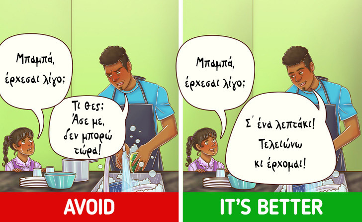 Καμιά φορά χάνεται κάθε δίκιο, αν ο τόνος μας είναι λάθος. Δείξε στα παιδιά ότι υπάρχει πάντα η επιλογή της κατανόησης και της ευγένειας, ακόμη κι όταν είμαστε πιεσμένοι. Απάντησέ τους με ηρεμία και ειλικρίνεια, δώσε τους να καταλάβουν ότι οι δυσκολίες μας μπορούν πάντα να ξεπεραστούν και να μην «περάσουν» με άσχημο τρόπο στους ανθρώπους που αγαπάμε.