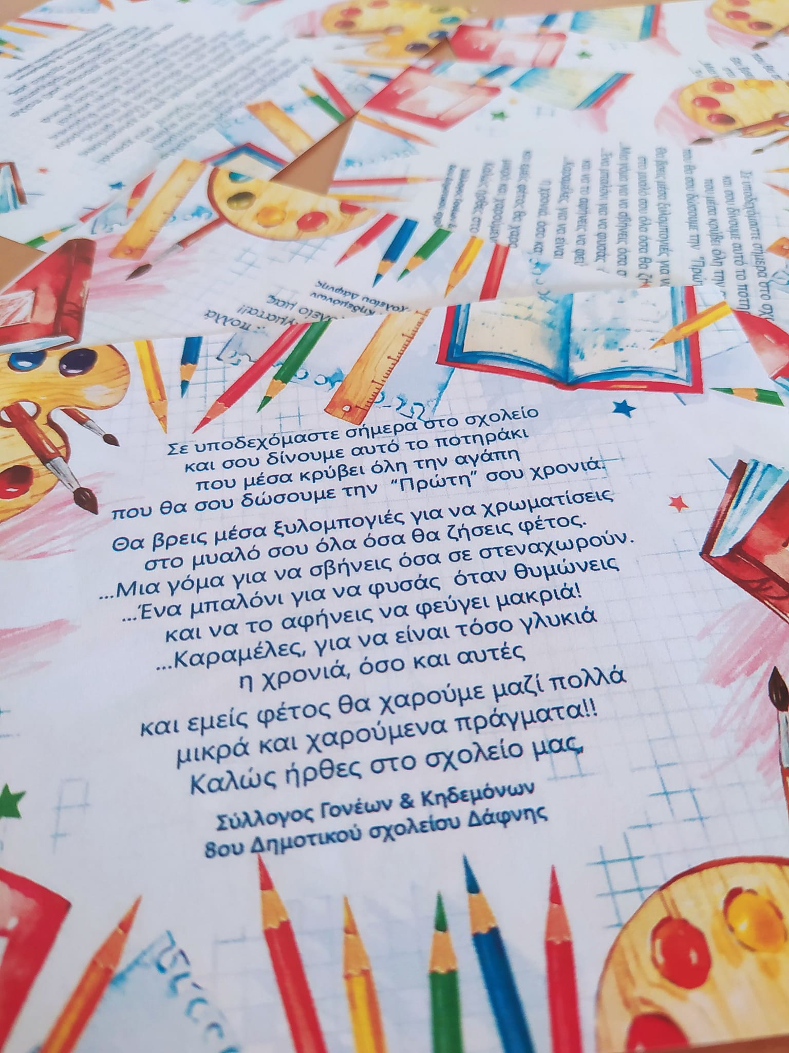 Συγκεκριμένα, το καλωσόρισμα των νέων μαθητών έγινε με ένα όμορφο δώρο που περιλάμβανε μεταξύ άλλων μολύβια, αυτοκόλλητα, μπαλόνια, γόμες και καραμέλες αλλά και ένα ζεστό μήνυμα που έγραφε: