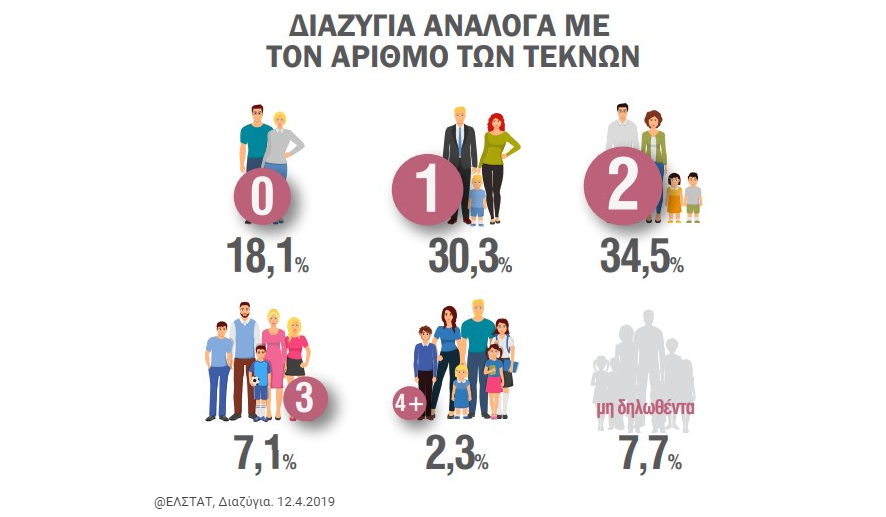 Ένα ακόμα ενδιαφέρον στοιχείο που προκύπτει από τα στατιστικά στοιχεία της ΕΛΣΤΑΤ είναι πως ο αριθμός των παιδιών επηρεάζει τον αριθμό των διαζυγίων. Συγκεκριμένα, όπως φαίνεται στο παρακάτω σχεδιάγραμμα, τα ζευγάρια που έχουν 1 ή 2 παιδιά είναι πιο πιθανό να χωρίσουν από τα ζευγάρια που δεν έχουν καθόλου παιδιά ή έχουν από 3 παιδιά και πάνω.