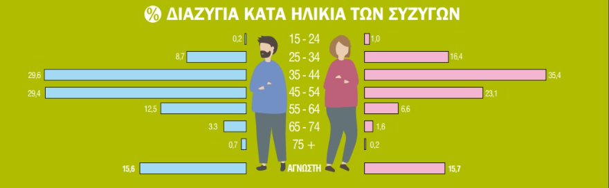 Τέλος, σύμφωνα πάντα με τα στατιστικά, φαίνεται πως, ανεξαρτήτως φύλου, η πλειονότητα των ανθρώπων χωρίζουν όταν είναι από 35 έως 44 ετών, αν και οι άντρες είναι πιθανό να ζητήσουν διαζύγιο από τα 45 μέχρι τα 54 τους έτη.