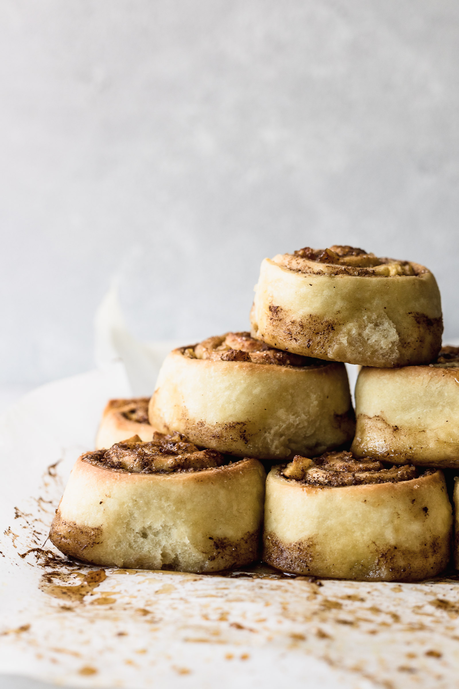 Ανοίγουμε τη ζύμη σε μεγάλο και παχύ φύλλο. Τη λαδώνουμε, πασπαλίζουμε με κανέλα και καστανή ζάχαρη, σκορπάμε κομμάτια μήλου παντού και τυλίγουμε σε ρολό. Κόβουμε το ρολό σε ροδέλες που τις τοποθετούμε στο ταψί σε λαδόκολλα.