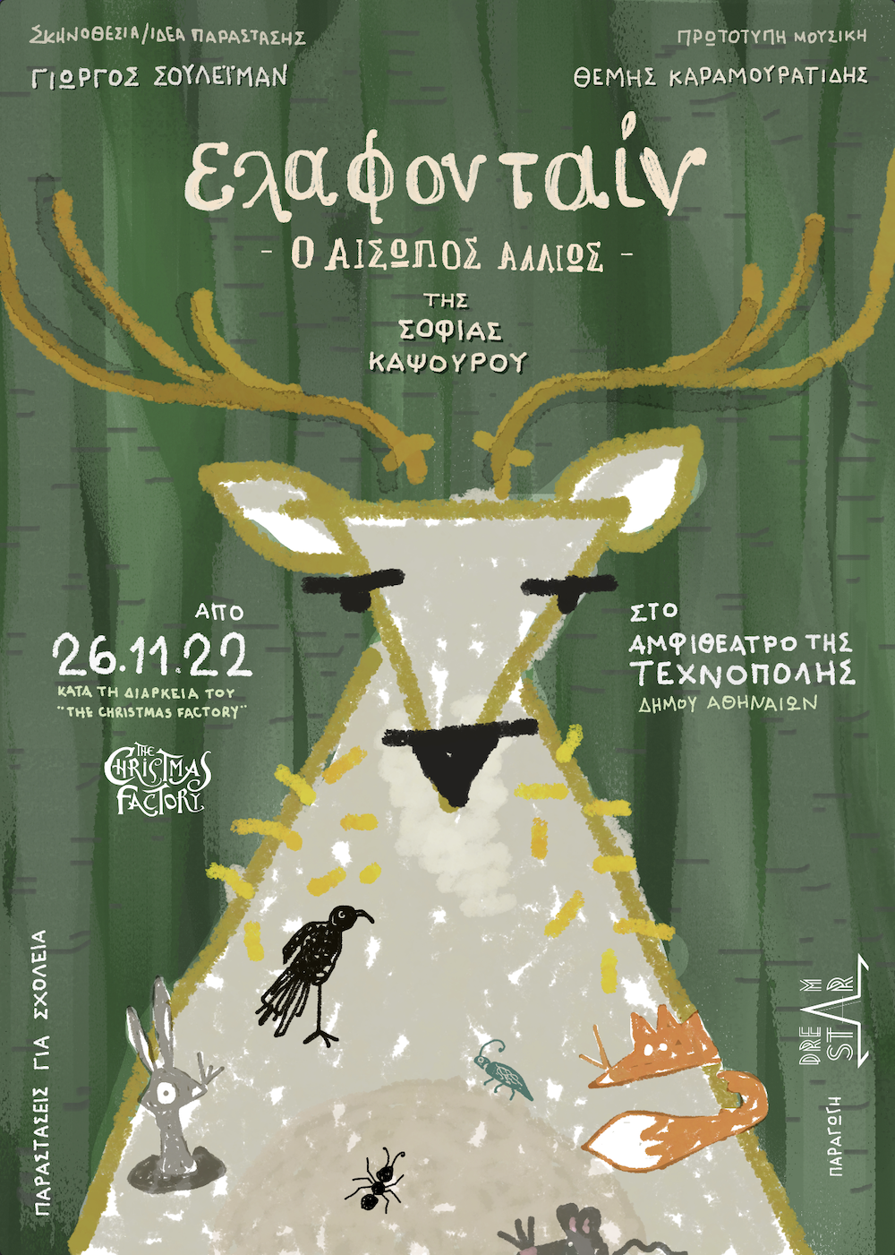 Φέτος, το The Christmas Factory περιλαμβάνει στο πλούσιο πρόγραμμά του και τη θεατρική παράσταση Ο «Ελαφονταίν, ο Αίσωπος αλλιώς» σε σκηνοθεσία και σύλληψη του Γιώργου Σουλεϊμάν, κείμενο της Σοφίας Καψούρου και πρωτότυπη μουσική του Θέμη Καραμουρατίδη. Μια εξαιρετική αφορμή να γνωρίσουν τα παιδιά τους Μύθους του Αισώπου μέσα από τα μάτια του Γάλλου ποιητή και μυθοποιού Ζαν ντε Λα Φονταίν (Jean de La Fontaine). Μια παράσταση – ωδή στη συνεργασία και στο «μαζί». Οι πρόβες έχουν ξεκινήσει και η σκηνή ήδη στήνεται στο ανακαινισμένο αμφιθέατρο –«διαμάντι» της Τεχνόπολης του Δήμου Αθηναίων.