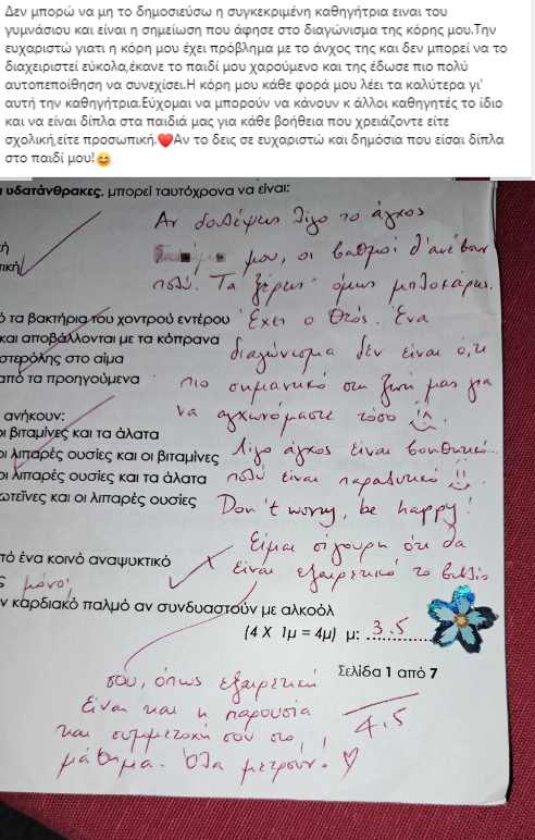 «Αν δουλέψεις λίγο το άγχος, οι βαθμοί θα ανέβουν πολύ. Το ξέρεις, όμως μπλοκάρεις. Έχει ο Θεός. Ένα διαγώνισμα δεν είναι ό,τι πιο σημαντικό στη ζωή μας για να αγχωνόμαστε τόσο. Λίγο άγχος είναι βοηθητικό, πολύ είναι παραλυτικό. Don΄t worry, be happy». έγραψε η καθηγήτρια.