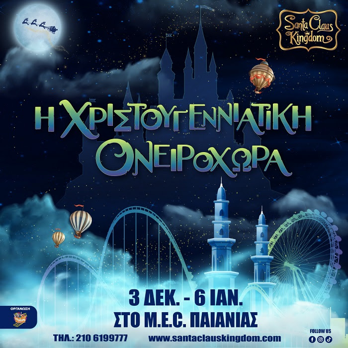 Από 3 Δεκεμβρίου το ωραιότερο παραμύθι του κόσμου ζωντανεύει στη Χριστουγεννιάτικη Ονειροχώρα του Santa Claus Kingdom στο Μ.Ε.C. Παιανίας. Το Santa Claus Kingdom, το Χριστουγεννιάτικο Πάρκο που έγινε θεσμός, μας καλεί όλους, μικρούς και μεγάλους, να ζήσουμε την πιο Μαγική Χριστουγεννιάτικη ιστορία και να απολαύσουμε αμέτρητα παιχνίδια με ΕΝΑ μόνο εισιτήριο!