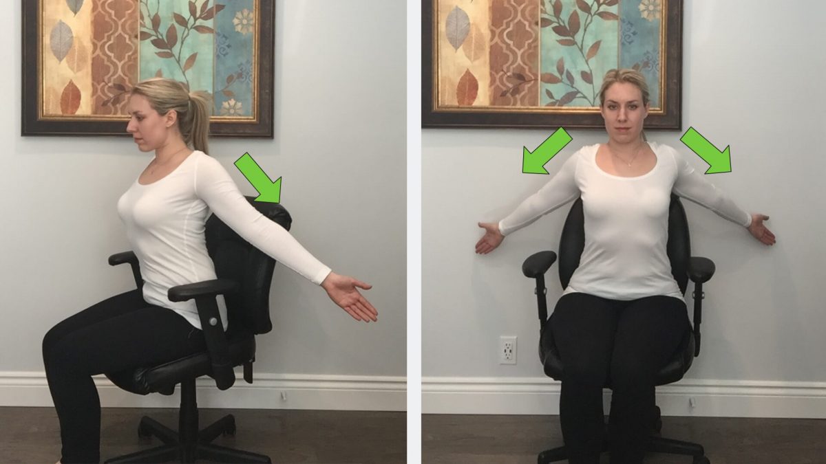Μια απλή διάταση για το άνοιγμα του στήθους που μπορείτε να κάνετε, περιλαμβάνει το να κάθεστε ίσια, να τεντώνετε τα χέρια σας σε κάθε πλευρά και να σπρώχνετε το στήθος σας προς τα εμπρός. Οι ώμοι και τα χέρια σας θα κινηθούν ελαφρώς προς τα πίσω. Όσες περισσότερες φορές το κάνετε μέσα στην ημέρα, τόσο το καλύτερο.