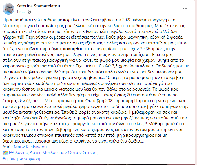 «Είμαι μαμά και εγώ παιδιού με καρκίνο. Τον Σεπτέμβριο του 2022 κάναμε εισαγωγή στο Νοσοκομείο γιατί ο παιδίατρος μας έβλεπε κάτι στην κοιλιά του παιδιού μας. Μας έκαναν τις απαραίτητες εξετάσεις και μας είπαν ότι έβλεπαν κάτι μεγάλο κοντά στα νεφρά, αλλά δεν ήξεραν τι!