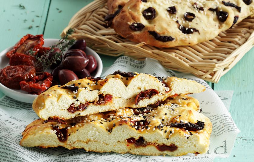 Λαγάνα με λιαστές ντομάτες και ελιές