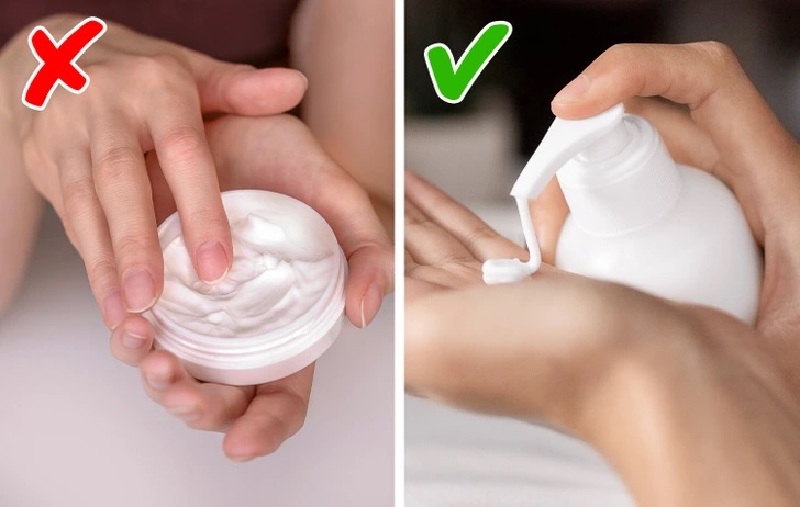 Τα χέρια μας μεταφέρουν βακτήρια, ακόμα κι αν τα πλένουμε τακτικά. Όταν βάζουμε τα δάχτυλά μας μέσα στο βαζάκι με την κρέμα, μεταφέρουμε αυτά τα μικρόβια και τη μολύνουμε, με αποτέλεσμα να αλλοιωθεί και στη συνέχεια να δημιουργήσει πρόβλημα και στο δέρμα μας. Προτείνουμε να βάζετε κρέμα με την ειδική σέσουλα ή με ένα κουτάλι του γλυκού.