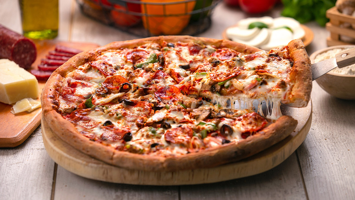 Απλώνουμε τη σάλτσα τομάτας, τις φέτες τυρί, προαιρετικά τις πιπεριές, τα μανιτάρια, τις τομάτες και το καλαμπόκι και πασπαλίζουμε με το τριμμένο τυρί. Αλατοπιπερώνουμε, βάζουμε την πίτσα στην πιο χαμηλή σχάρα και ψήνουμε για περίπου 40 λεπτά,.