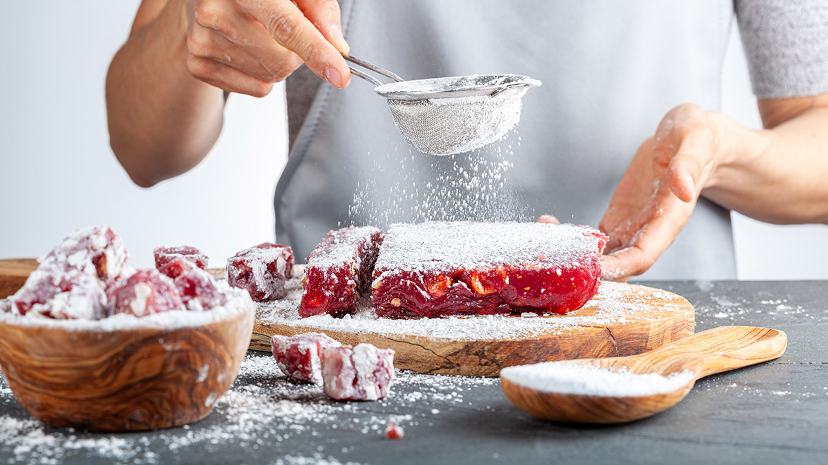 - Πασπαλίζουμε την επιφάνεια του λουκουμιού με μια λεπτή στρώση ζάχαρη άχνη.