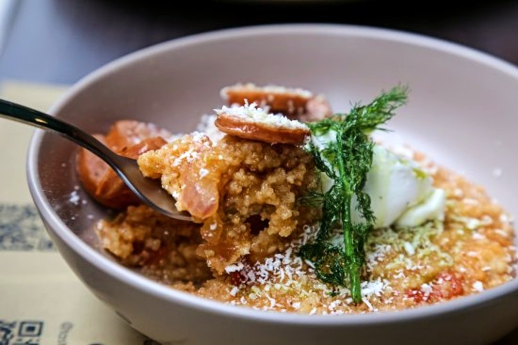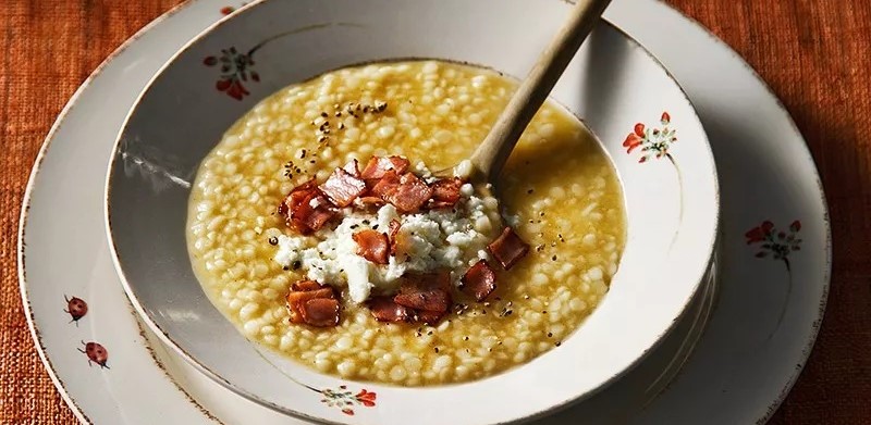 Τραχανάς με απάκι, πιπεριές και γραβιέρα