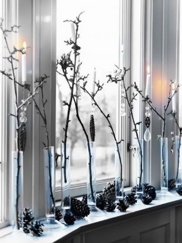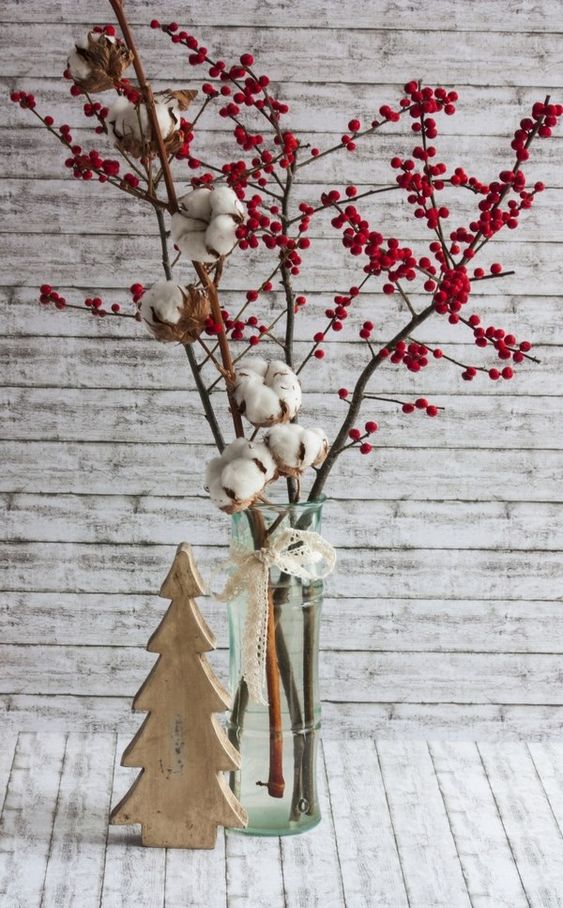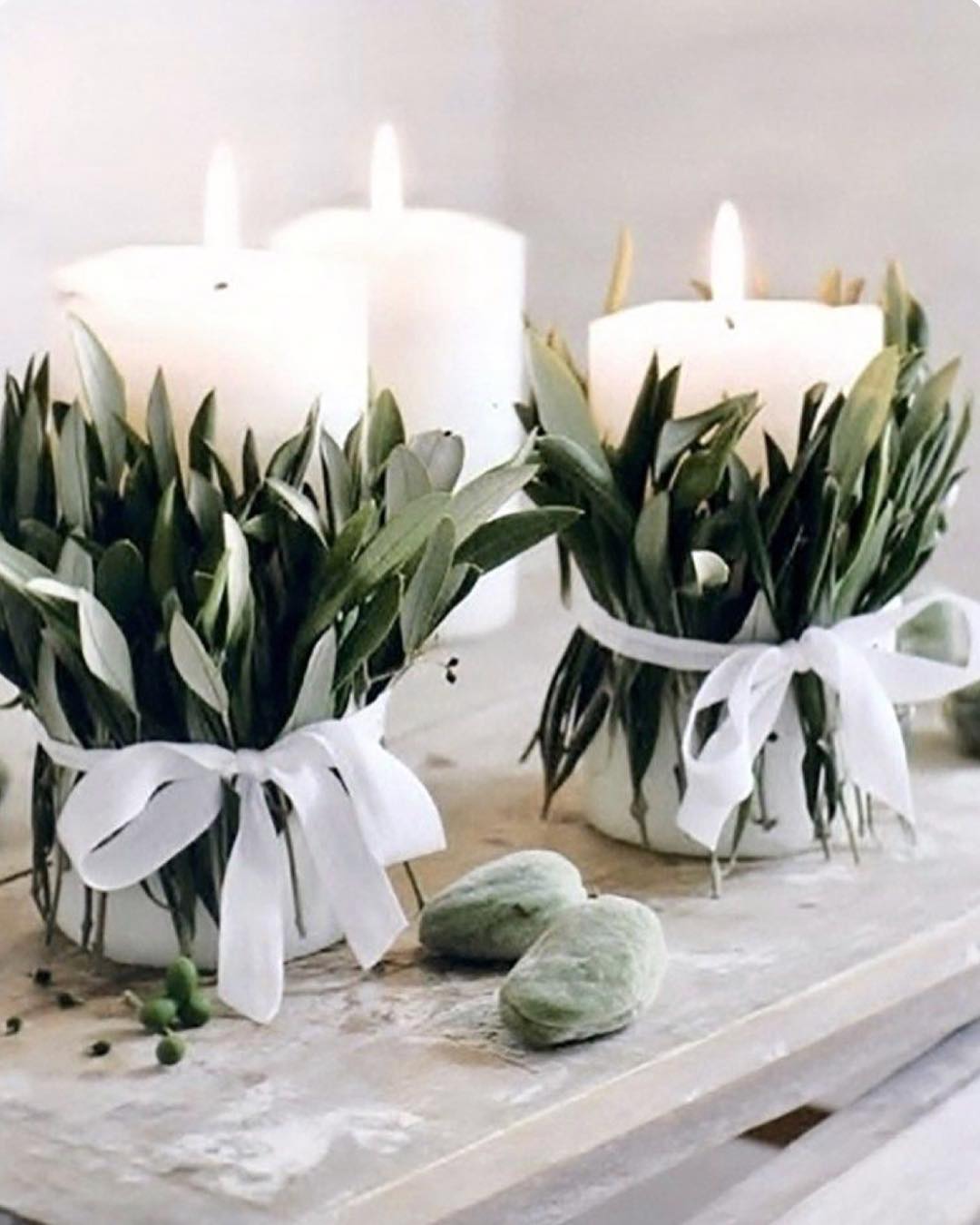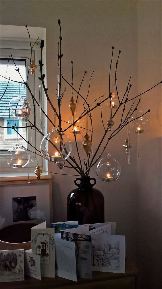 Σε διάφορες γωνιές του σπιτιού, βάλτε βάζα με κλαδιά από έλατο, ελιά ή αμυγδαλιά (μπορείτε να μαζέψετε από το κοντινό πάρκο ή να αγοράσετε), τα οποία δίνουν μια όμορφη και ζεστή αίσθηση χωρίς να «βαραίνουν» τον χώρο. Συνδυάστε τα με αρωματικά κεριά, φύλλα ελιάς ή κόκκινα γκι.