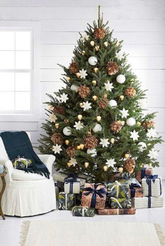 Αντί το δέντρο σας να είναι ασφυκτικά γεμάτο με μπάλες και στολίδια σε όλα τα χρώματα και τα σχέδια όπως συνηθίζεται, προτιμήστε ομοιόμορφα στολίδια σε λευκό, καφέ ή παλ χρώμα. Μια καλή ιδέα είναι να αντικαταστήσετε τα στολίδια με ξύλινα γούρια ή κουκουνάρια.