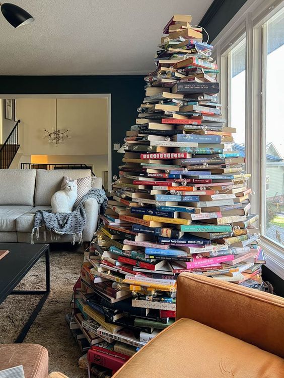 Αν έχετε βιβλιοθήκη στο σαλόνι μπορείτε να αλλάξετε την διάταξη των βιβλίων για τις γιορτινές ημέρες και να τα τοποθετήσετε έτσι ώστε να σχηματίζουν ένα εικονικό δέντρο από βιβλία.