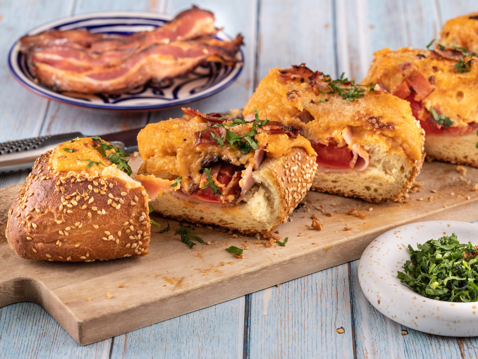 Απλώνουμε τις φέτες του ζαμπόν, τη ντομάτα, το μισό μπέικον, απλώνουμε τη μπεσαμέλ, πασπαλίζουμε με την παρμεζάνα και ψήνουμε στον φούρνο, μέχρι να πάρει καλό χρώμα. Πασπαλίζουμε με το υπόλοιπο μπέικον και τον μαϊντανό, κόβουμε σε φέτες και σερβίρουμε αμέσως.