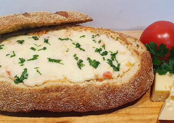 Κόβουμε οριζόντια το πάνω μέρος από το ψωμί και αφαιρούμε την ψίχα. Σοτάρουμε το κοτόπουλο μέχρι να ψηθεί και μετά προσθέτουμε όλα τα άλλα υλικά να ψηθούν και στο τέλος βάζουμε την φρέσκια κρέμα σε μέτρια φωτιά μέχρι να δέσει.