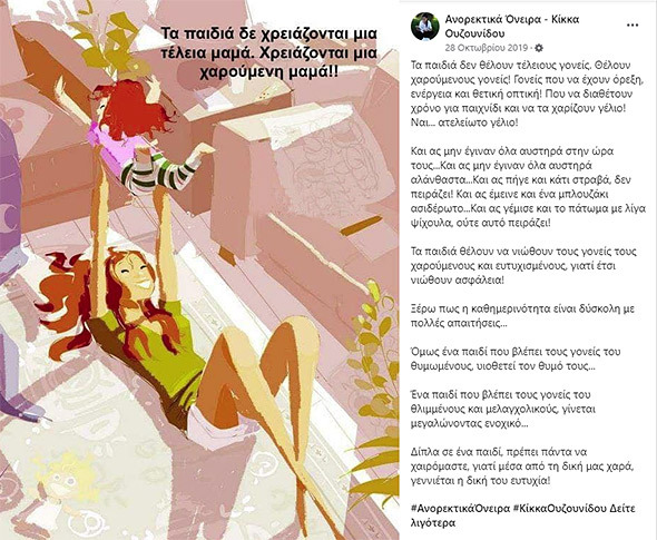 «Τα παιδιά δεν θέλουν τέλειους γονείς. Θέλουν χαρούμενους γονείς! Γονείς που να έχουν όρεξη, ενέργεια και θετική οπτική! Που να διαθέτουν χρόνο για παιχνίδι και να τα χαρίζουν γέλιο! Ναι... ατελείωτο γέλιο!