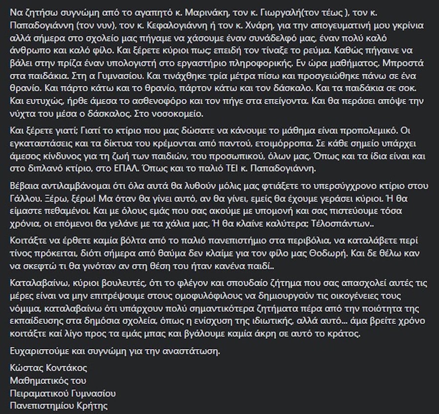 Την ίδια ώρα, καθηγητές καταγγέλλουν άθλιες συνθήκες κτιρίου που θέτουν σε κίνδυνο την ασφάλεια όλων. Χαρακτηριστικό είναι, άλλωστε, το παρακάτω κείμενο του καθηγητή Κώστα Κοντάκου, που είναι μαθηματικός στο εν λόγω Πειραματικό Γυμνάσιο για το περιστατικό: