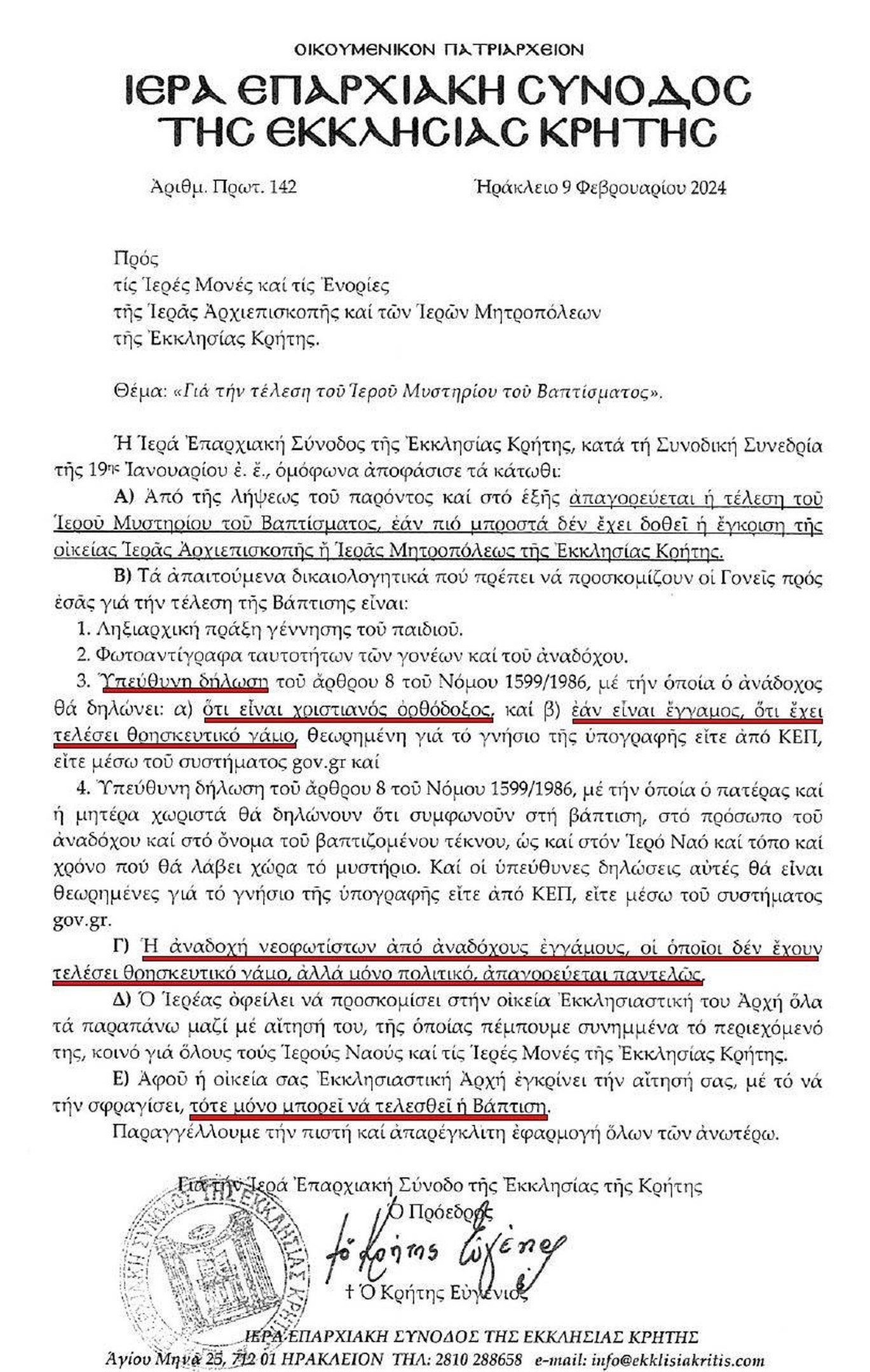 Ειδικότερα, με βάση τα όσα αναφέρονται στην εγκύκλιο που δημοσιεύει το cretalive.gr, πλέον οι βαπτίσεις θα τελούνται αφού προηγηθεί έγκριση από την Αρχιεπισκοπή Κρήτης ή την οικεία Μητρόπολη.