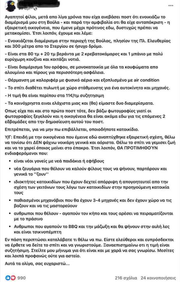 «Αγαπητοί φίλοι, μετά από λίγα χρόνια που είχα ανεβάσει ποστ ότι ενοικιάζω το διαμέρισμά μου στη Βούλα – και παρά την αμφιβολία ότι θα είχε ανταπόκριση – η εξαιρετική οικογένεια, που έμενε μέχρι πρότινος εδώ, δυστυχώς πρέπει να μετακομίσει.
