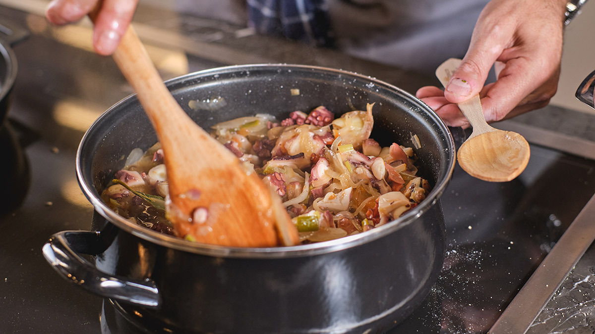 Το βγάζουμε σε ξύλο κοπής και το κόβουμε σε μέτρια κομμάτια. Αδειάζουμε το ζουμί που έμεινε στην κατσαρόλα σε ένα μπολ, καθαρίζουμε την κατσαρόλα και τη βάζουμε σε δυνατή φωτιά μαζί με το λάδι, το χταπόδι, τα κρεμμύδια, το σκόρδο, τη δάφνη και τα μπαχαρικά.