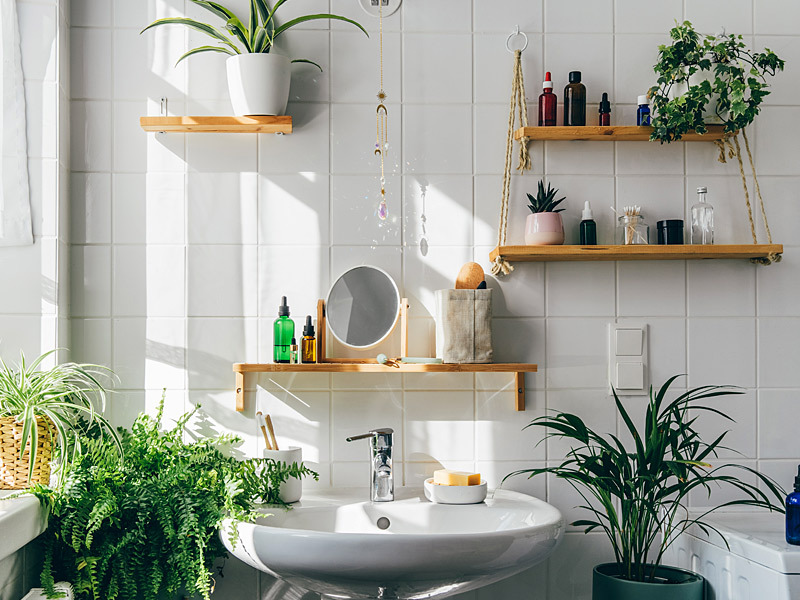 Τα φυτά εσωτερικού χώρου δίνουν άλλο χρώμα και ατμόσφαιρα στο μπάνιο. Το ίδιο μπορούν να κάνουν και τα βότσαλα, τα οποία μπορείτε να τοποθετήσετε στις άκρες της μπανιέρας, στον νιπτήρα ή σε κάποιο βάζο.