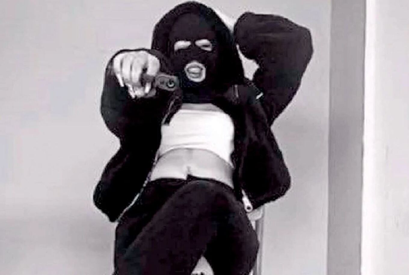 Στο ίδιο καρέ που φέρεται να έχει τραβηχτεί σε σχολική αίθουσα, η κοπέλα φοράει μια κουκούλα full face, σαν αυτές που χρησιμοποιούν εγκληματίες, και βγάζει τη γλώσσα θεωρώντας ότι όλο αυτό πρόκειται για αστείο.