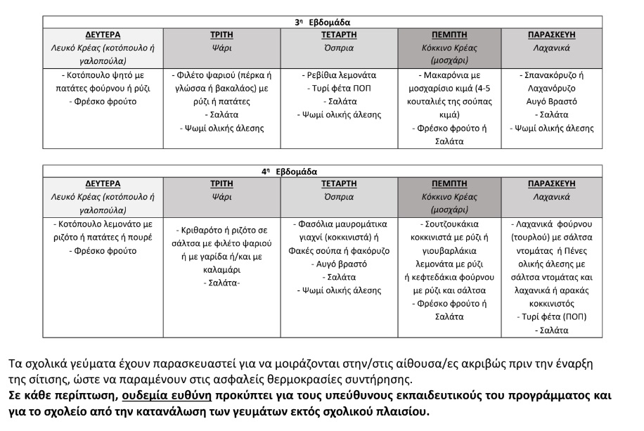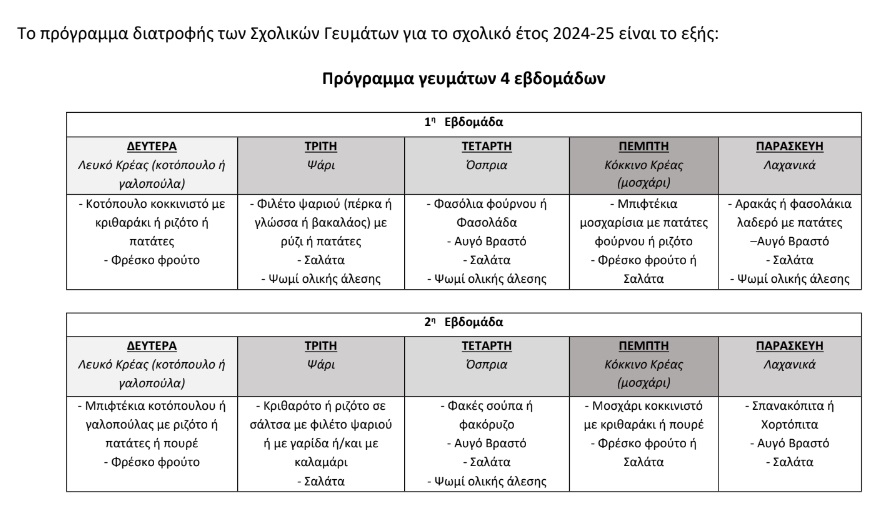 Το φετινό πρόγραμμα σίτισης μαθητών θα υλοποιηθεί σε 1882 δημοτικά σχολεία, ενώ στην εγκύκλιο περιλαμβάνεται το πρόγραμμα διατροφής ανά ημέρα (μενού), το οποίο είναι το εξής: