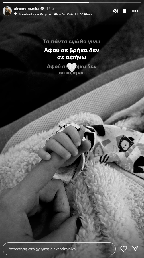 Στο story της Αλεξάνδρας βλέπουμε τον μικρό να της κρατάει το χέρι, ενώ παίζει από πίσω το τραγούδι του Κωνσταντίνου Αργυρού «Αφού σε βρήκα δεν σ' αφήνω».