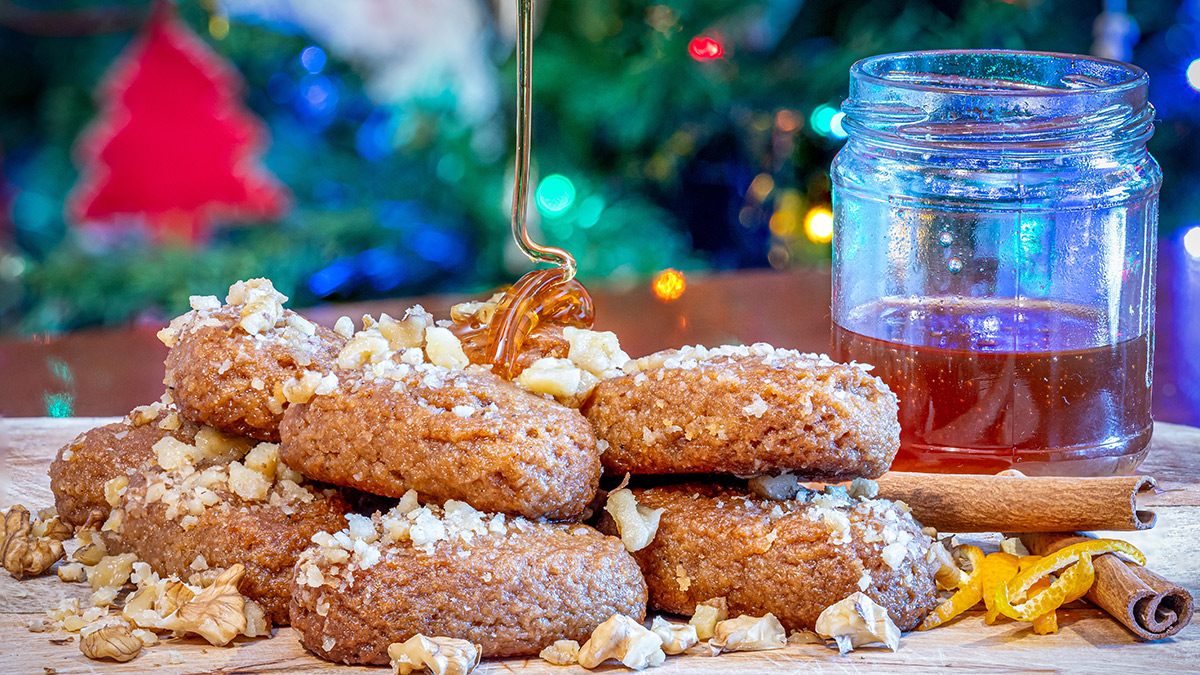 Τακτοποιούμε τα μελομακάρονα σε μεγάλη πιατέλα και πασπαλίζουμε με τα ψιλοκομμένα καρύδια.