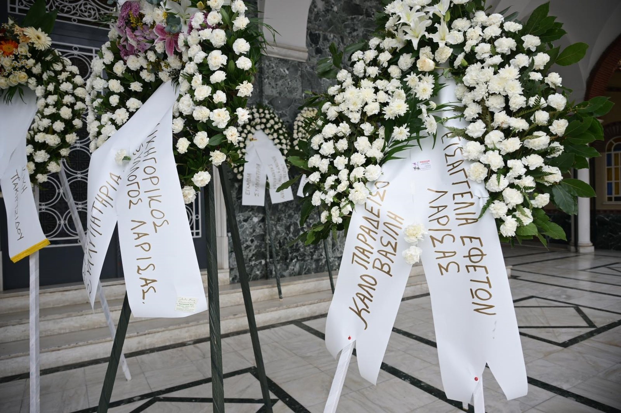 Στεφάνια έχουν στείλει μεταξύ άλλων και βρίσκονται έξω από την εκκλησία, η Ένωση Δικαστών και Εισαγγελέων, η πρόεδρος και οι δικαστές του Αρείου Πάγου, η Εισαγγελία Πρωτοδικών Λάρισας, ο Δικηγορικός Σύλλογος Λάρισας κ.α.